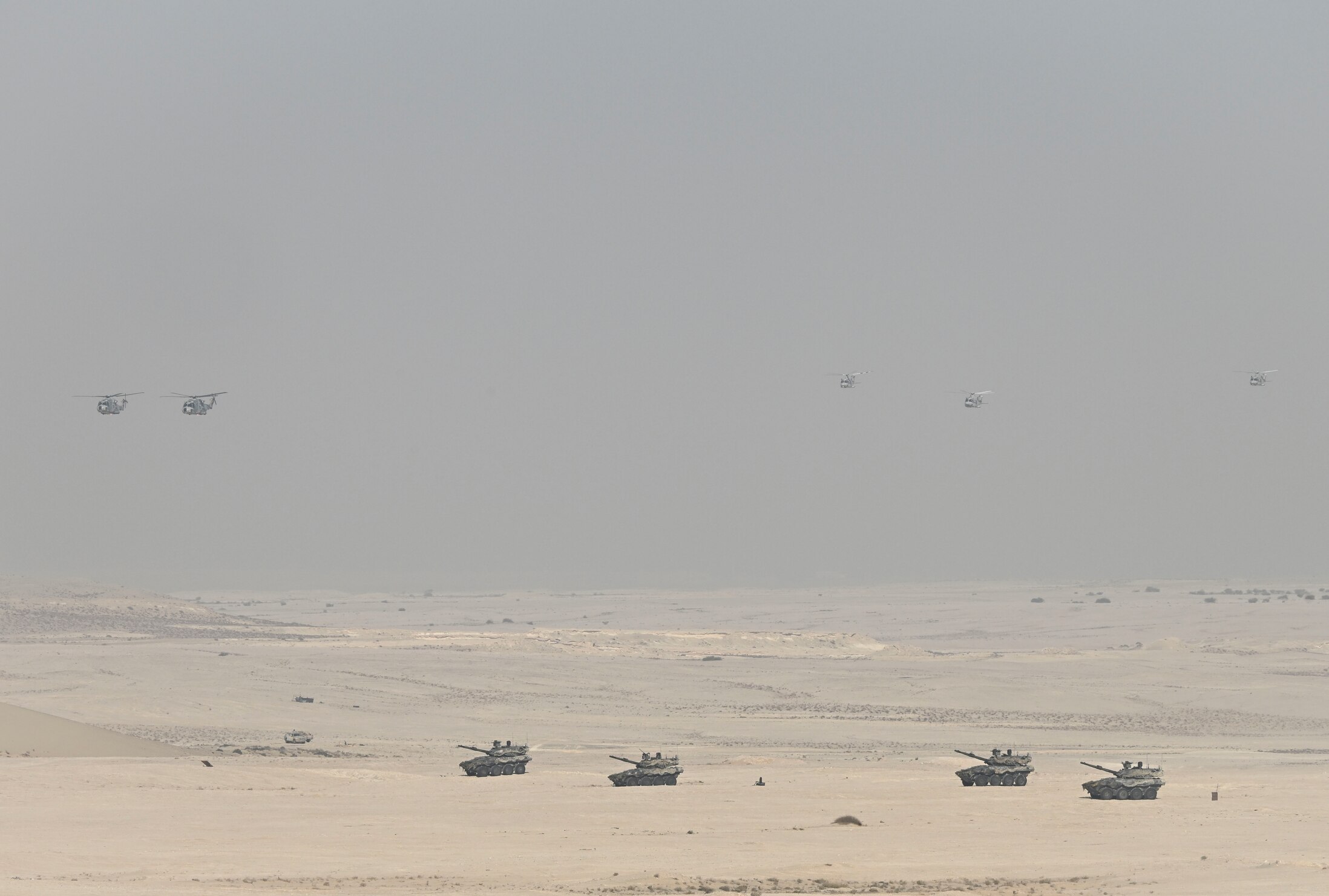 Military equipment from Qatar, Italy, the United Kingdom, Turkey and France is demonstrated during exercise Ferocious Falcon 6 within the U.S. Central Command area of responsibility, Nov. 20, 2025. Ferocious Falcon 6 is a biennial, Qatar-hosted multinational joint exercise designed to enhance lethality and combat efficiency among U.S. and allied forces. (U.S. Air Force photo by Senior Master Sgt. Richard P. Ebensberger)