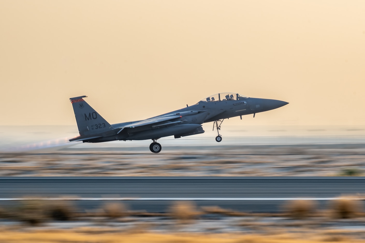 A U.S. Air Force F-15E Strike Eagle aircraft lifts off the runway during exercise Marauder Shield 26.1 within the U.S. Central Command area of responsibility, Nov. 11, 2025. The exercise focused on integrated Kuwaiti Command and Control systems, shaping regional airspace management and facilitating joint operations. This enhanced command and control integration paved the way for more effective Agile Combat Employment strategies, allowing for rapid deployment and flexible response to emerging threats. (U.S. Air Force photo by Staff Sgt. Tylin Rust)