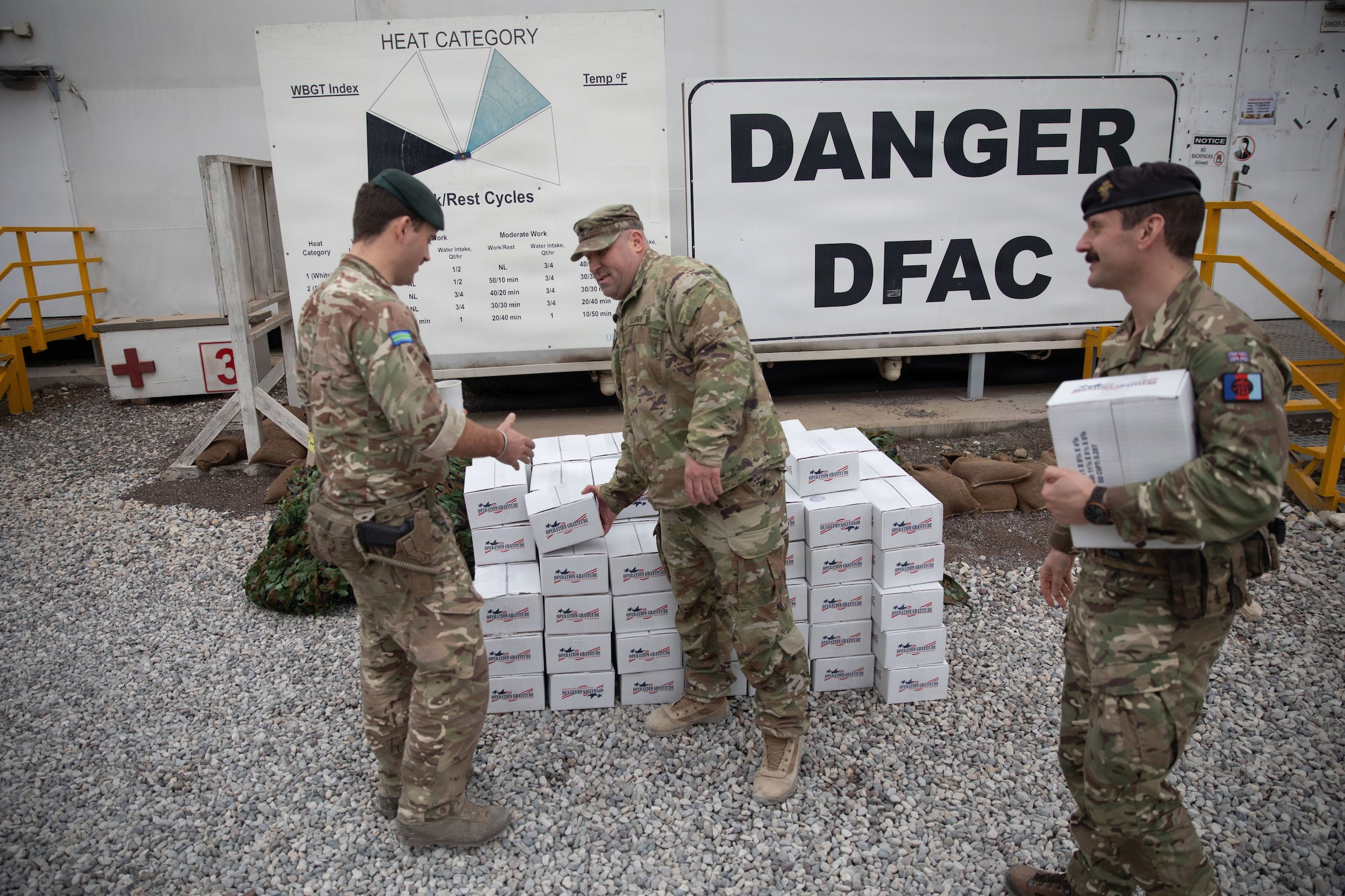 U.S. Army Sgt. Maj. Chad Fischer, operations sergeant major for 2nd Brigade Combat Team, 34th Infantry Division, Iowa National Guard, gives packages from Operation Gratitude to two coalition soldiers in front of Logistics Support Area Danger’s dining facility located in Erbil Air Base, Iraq, Dec. 14, 2025. Operation Gratitude honors service members with year-round appreciation, meaningful engagement opportunities, and care packages that recognize their service and sacrifice. (U.S. Army Photo by Pfc. Jordan Foster)