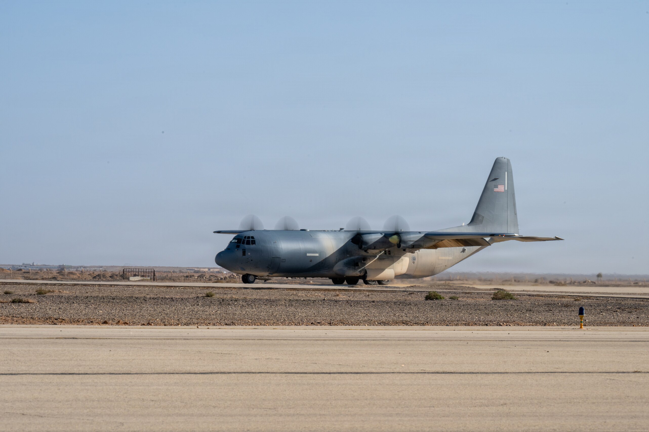 A U.S. Air Force C-130J Super Hercules aircraft assigned to the 61st Expeditionary Aircraft Maintenance Squadron lands during a readiness and dispersal exercise in the U.S. Central Command area of responsibility, Jan. 27, 2026. The exercise was designed to strengthen Ninth Air Force’s (Air Force Central) ability to disperse combat airpower throughout the U.S. Central Command area of responsibility, adding strategic ambiguity to adversary decision-making. (U.S. Air Force photo by Staff Sgt. Nathan Wingate)