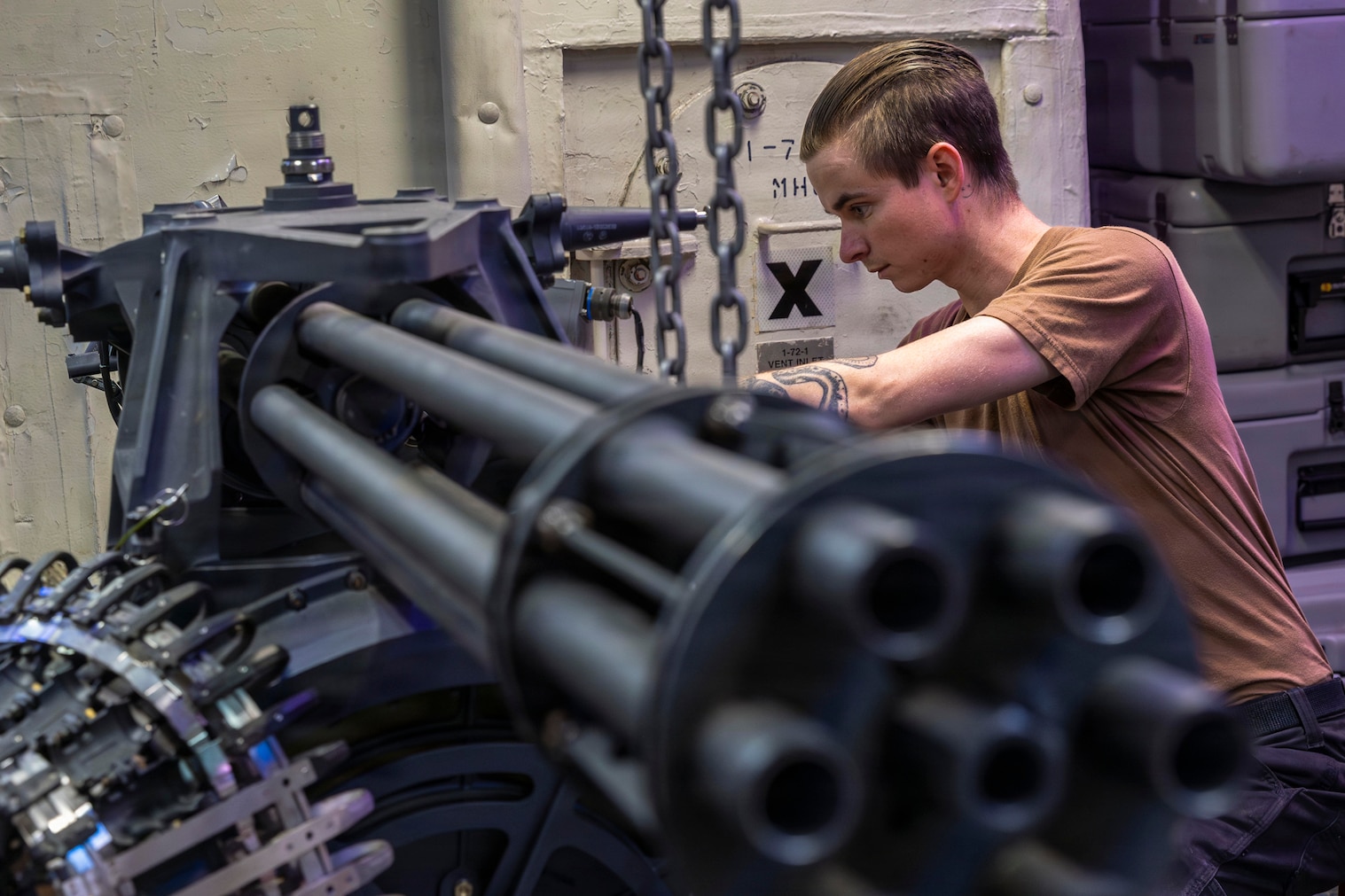 U.S. CENTRAL COMMAND AREA OF RESPONSIBILITY (Jan. 27, 2026) U.S. Navy Aviation Ordnanceman 3rd Class Gabriel Marshall conducts maintenance on an M61A2 gatling gun aboard the Nimitz-class aircraft carrier USS Abraham Lincoln (CVN 72) in the U.S. Central Command (CENTCOM) area of responsibility, Jan 27. Abraham Lincoln is deployed to the U.S. 5th Fleet area of operations to support maritime security and stability in the CENTCOM area of responsibility. (U.S. Navy photo by Mass Communication Specialist Seaman Samuel Evarts)