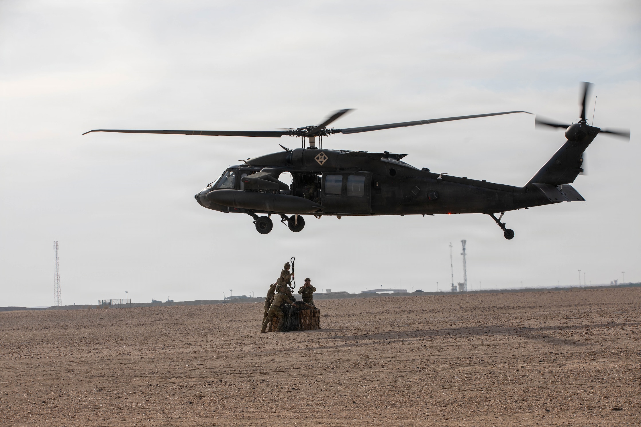 Soldiers assigned to U.S. Army Central conduct UH-60 Blackhawk sling-load training during a Pathfinder School field training exercise in the U.S. Central Command area of responsibility, Jan. 27, 2026. Pathfinder School trains Soldiers on aircraft orientation and helicopter landing zone operations, close combat assault, ground-to-air communication procedures, and sling-load operations. (U.S. Army photo by Capt. Bernard Jenkins)