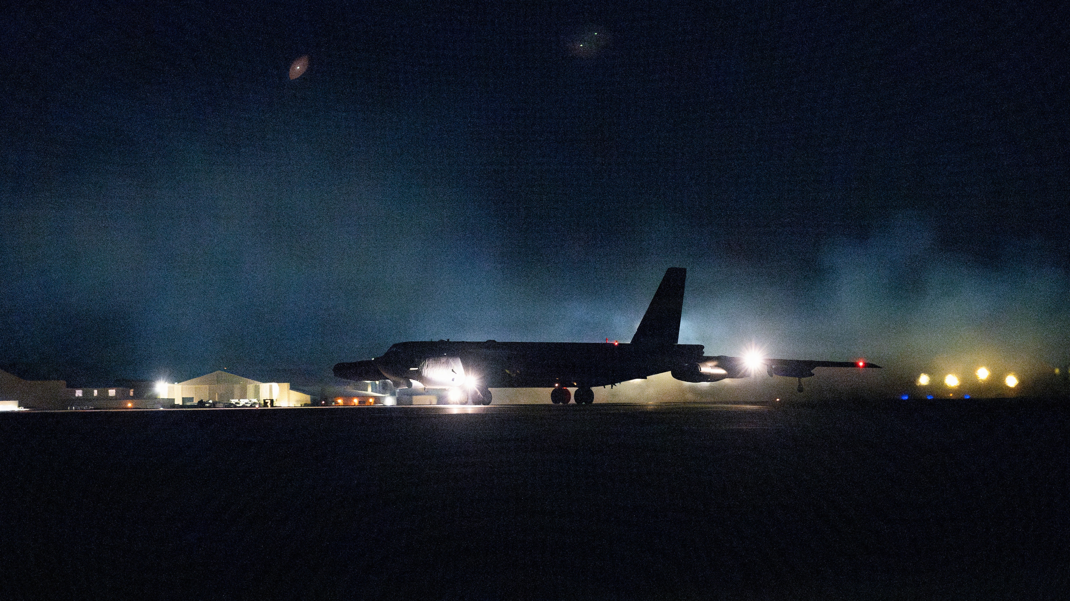 A U.S. Air Force B-52H Stratofortress bomber taxis for takeoff in support of Operation Epic Fury, March 2, 2026. (U.S. Air Force Photo)