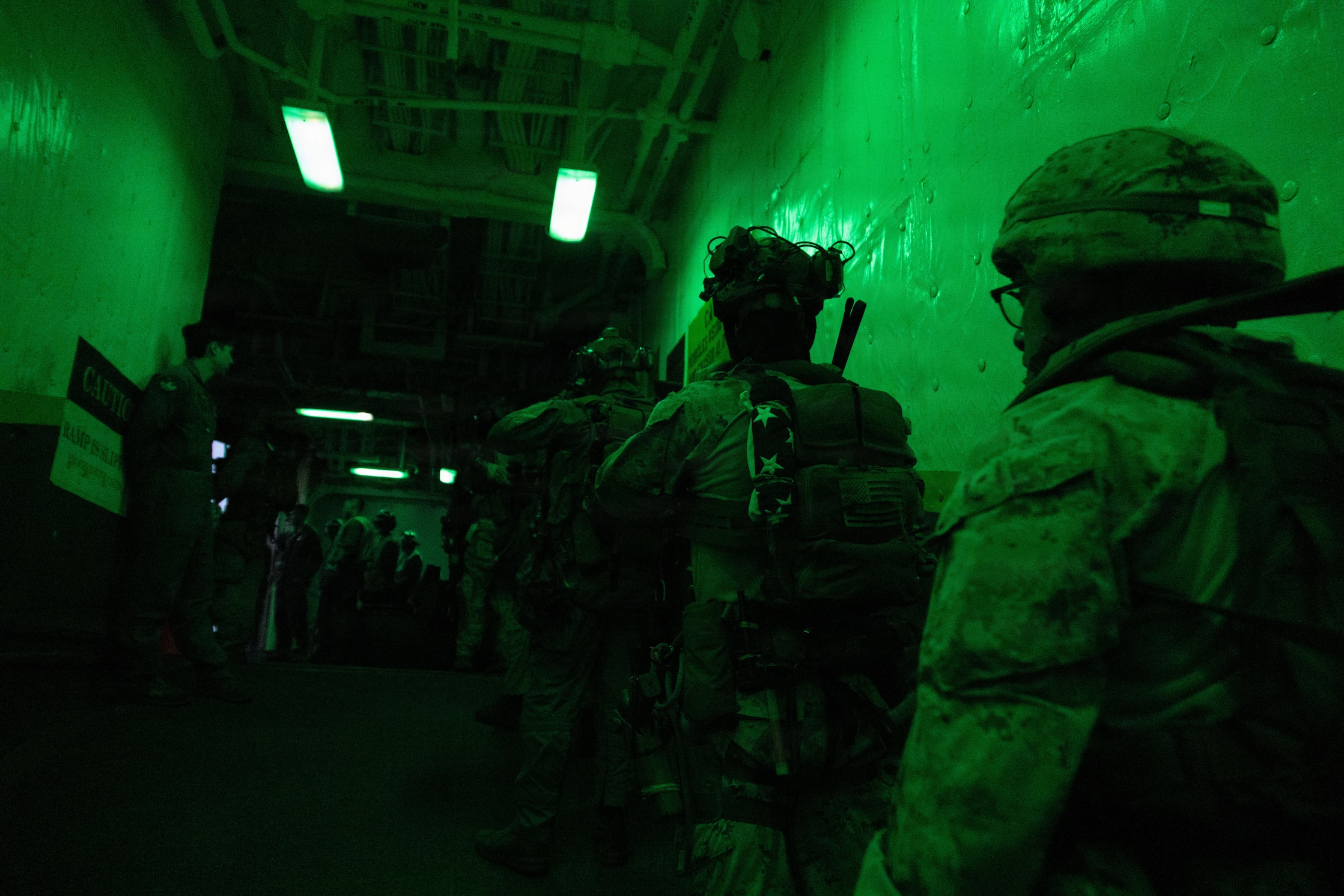 U.S. Marines from the 31st Marine Expeditionary Unit depart USS Tripoli (LHA 7) to board M/V Blue Star III, a commercial ship suspected of attempting to transit to Iran in violation of the U.S. blockade of Iranian ports, April 28, 2026. U.S. forces released the vessel after conducting a search and confirming the ship’s voyage would not include an Iranian port call. (U.S. Marine Corps photo)