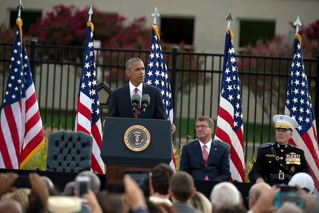 President Barack Obama speaks at the 15th Anniversary of 9/11 commemoration ceremony at the Pentagon in Arlington, Va. Sept. 11, 2016. (DoD photo by EJ Hersom)