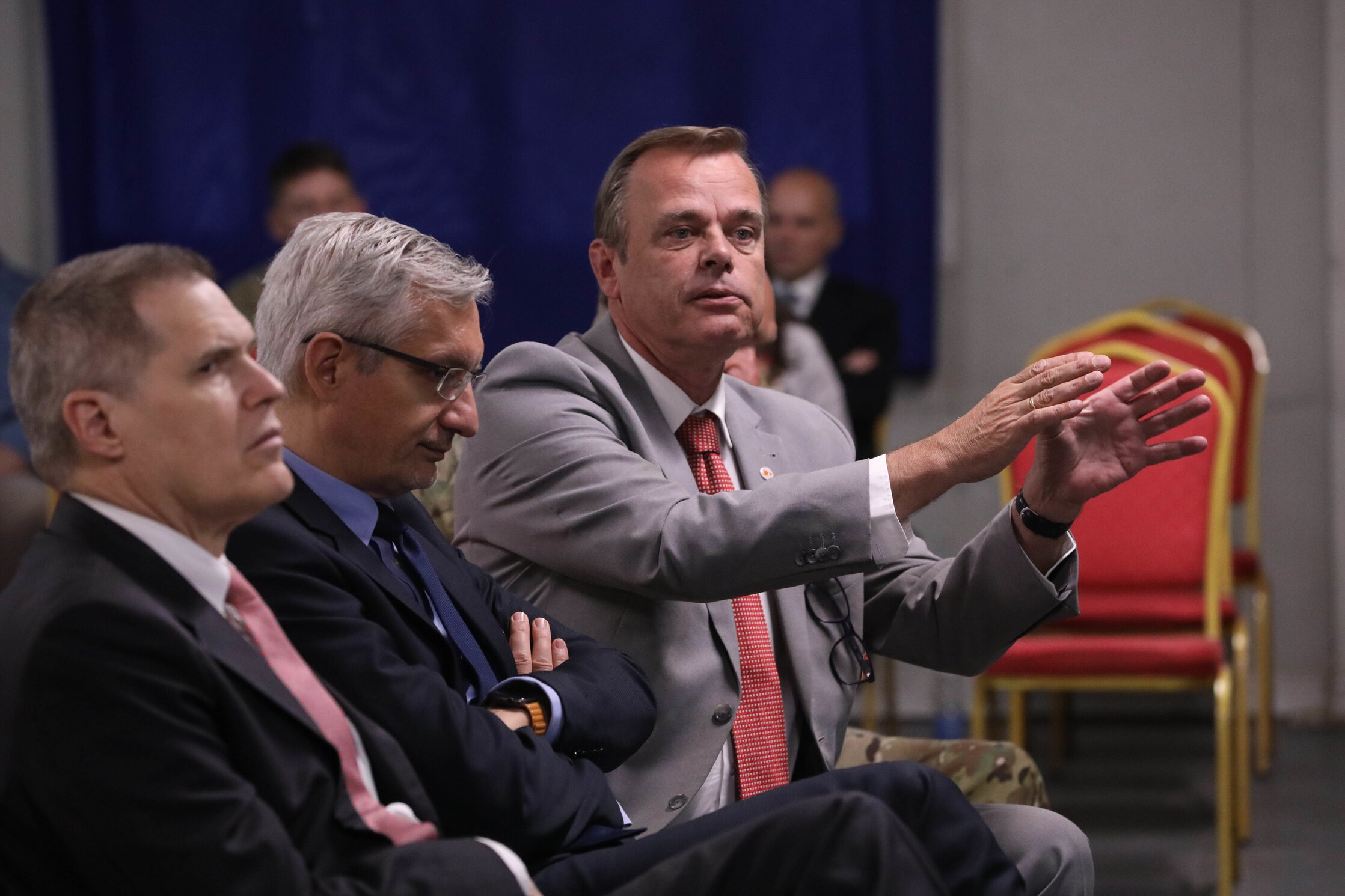 Michel Rentenaar, Netherlands Ambassador to Iraq, elaborates on a question during the Ambassadors Day event at Union III forward operating base in Baghdad, Iraq, April 21, 2022. During the CJTF-OIR-hosted event, representatives from more than 25 Coalition countries discussed the CJTF-OIR mission and broad efforts to tackle enduring regional security and stability challenges. (U.S. Army photo by Staff Sgt. Bree-Ann Ramos-Clifton)