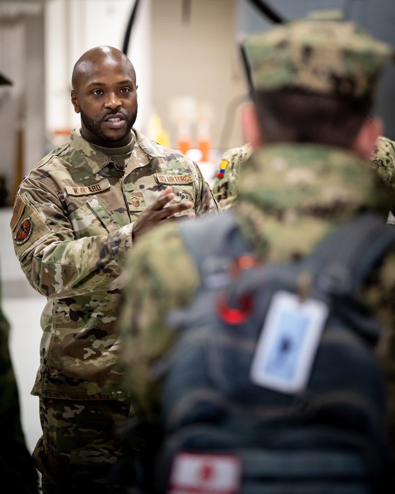 U.S. Air Force Master Sgt. Kevin Woodard, non-commissioned officer in charge of the Kentucky Air National Guard’s Fatality Search and Recovery Team, provides a mission brief to Ecuadorian military leaders at the Kentucky Air National Guard Base in Louisville, Ky., Jan. 31, 2024. The Ecuadorians are visiting this week to exchange information with the Kentucky National Guard as part of the State Partnership Program, a National Guard Bureau effort that pairs Guard units with foreign allies to foster enhanced understanding across all aspects of civil and military affairs. (U.S. Air National Guard photo by Dale Greer)