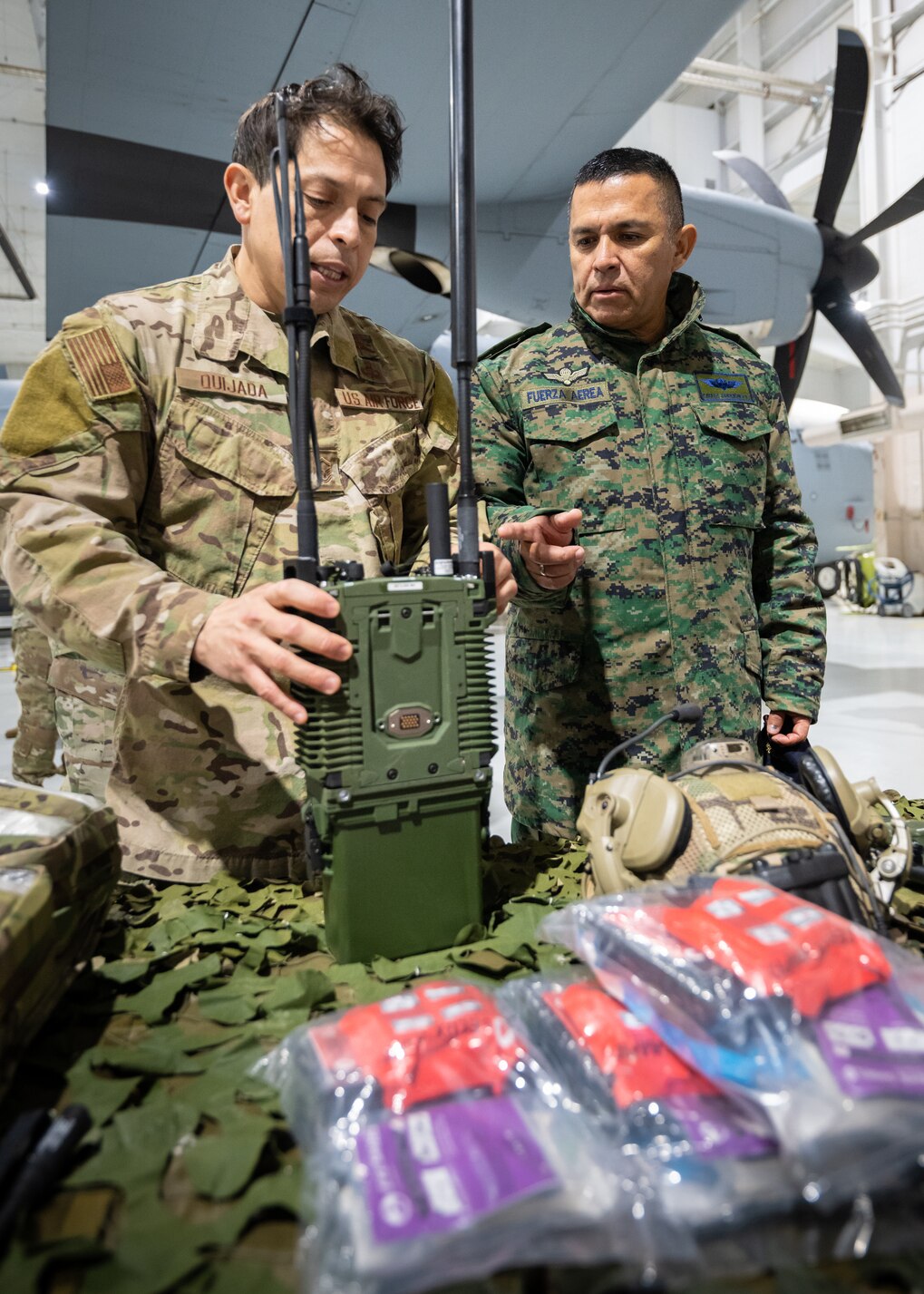 U.S. Air Force Master Sgt. Elmer Quijada, left, a pararescueman assigned to the Kentucky Air National Guard’s 123rd Special Tactics Squadron, discusses the unit’s radio equipment with Ecuadorian Air Force Chief Master Sgt. Carlos Humberto Rodriguez Castillo at the Kentucky Air National Guard Base in Louisville, Ky., Jan. 31, 2024. A group of Ecuadorian military leaders are visiting this week to exchange information with the Kentucky National Guard as part of the State Partnership Program, a National Guard Bureau effort that pairs Guard units with foreign allies to foster enhanced understanding across all aspects of civil and military affairs. (U.S. Air National Guard photo by Dale Greer)