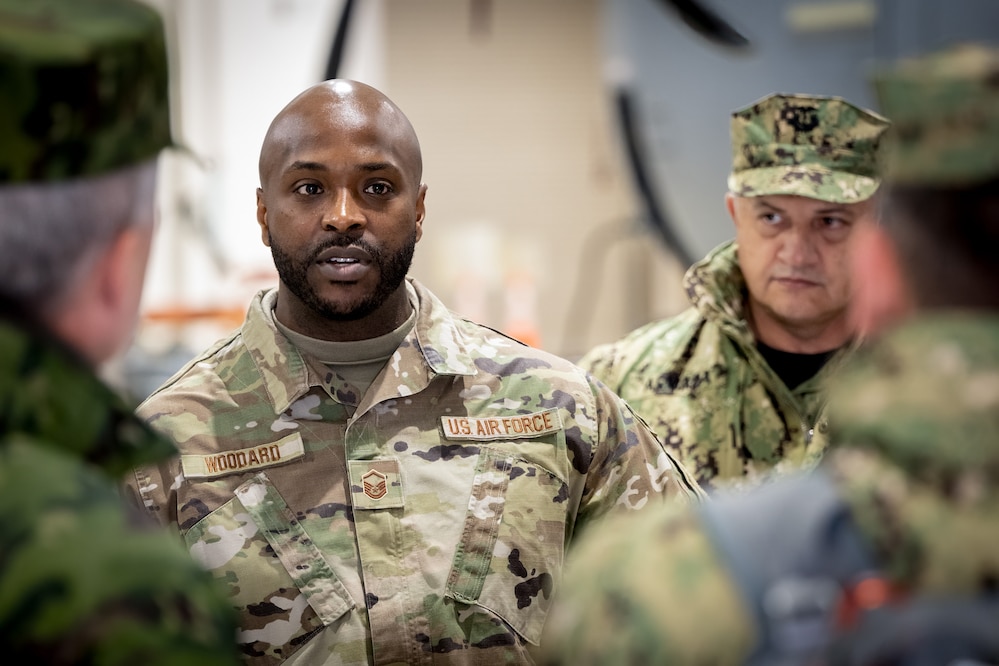 U.S. Air Force Master Sgt. Kevin Woodard, non-commissioned officer in charge of the Kentucky Air National Guard’s Fatality Search and Recovery Team, provides a mission brief to Ecuadorian military leaders at the Kentucky Air National Guard Base in Louisville, Ky., Jan. 31, 2024. The Ecuadorians are visiting this week to exchange information with the Kentucky National Guard as part of the State Partnership Program, a National Guard Bureau effort that pairs Guard units with foreign allies to foster enhanced understanding across all aspects of civil and military affairs. (U.S. Air National Guard photo by Dale Greer)