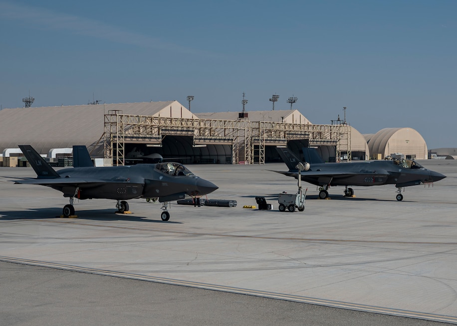 Two U.S. Air Force F-35A Lightning IIs are staged at Al Dhafra Air Base, United Arab Emirates, on Nov. 17, 2025. The aircraft will be used by the team to perform at the Dubai Airshow, showcasing the power and precision of America’s most advanced fifth-generation fighter. (U.S. Air Force photo by Staff Sgt. Nicholas Rupiper)
