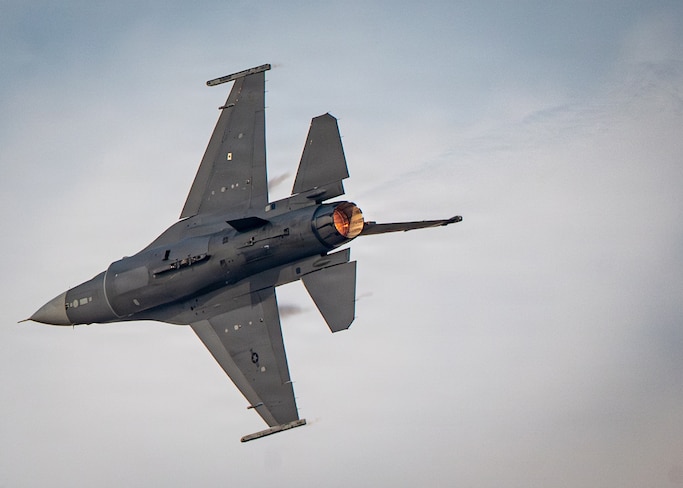 A U.S. Air Force F-16C Fighting Falcon assigned to the 555th Fighter Squadron in Aviano Air Base, Italy, performs aerial maneuvers Nov. 16, 2025, over Al Maktoum International Airport in Dubai, United Arab Emirates. The multi-role fighter aircraft rehearsed its performance prior to the Dubai Airshow 2025. (U.S. Air Force photo by Tech. Sgt. Justin Norton)