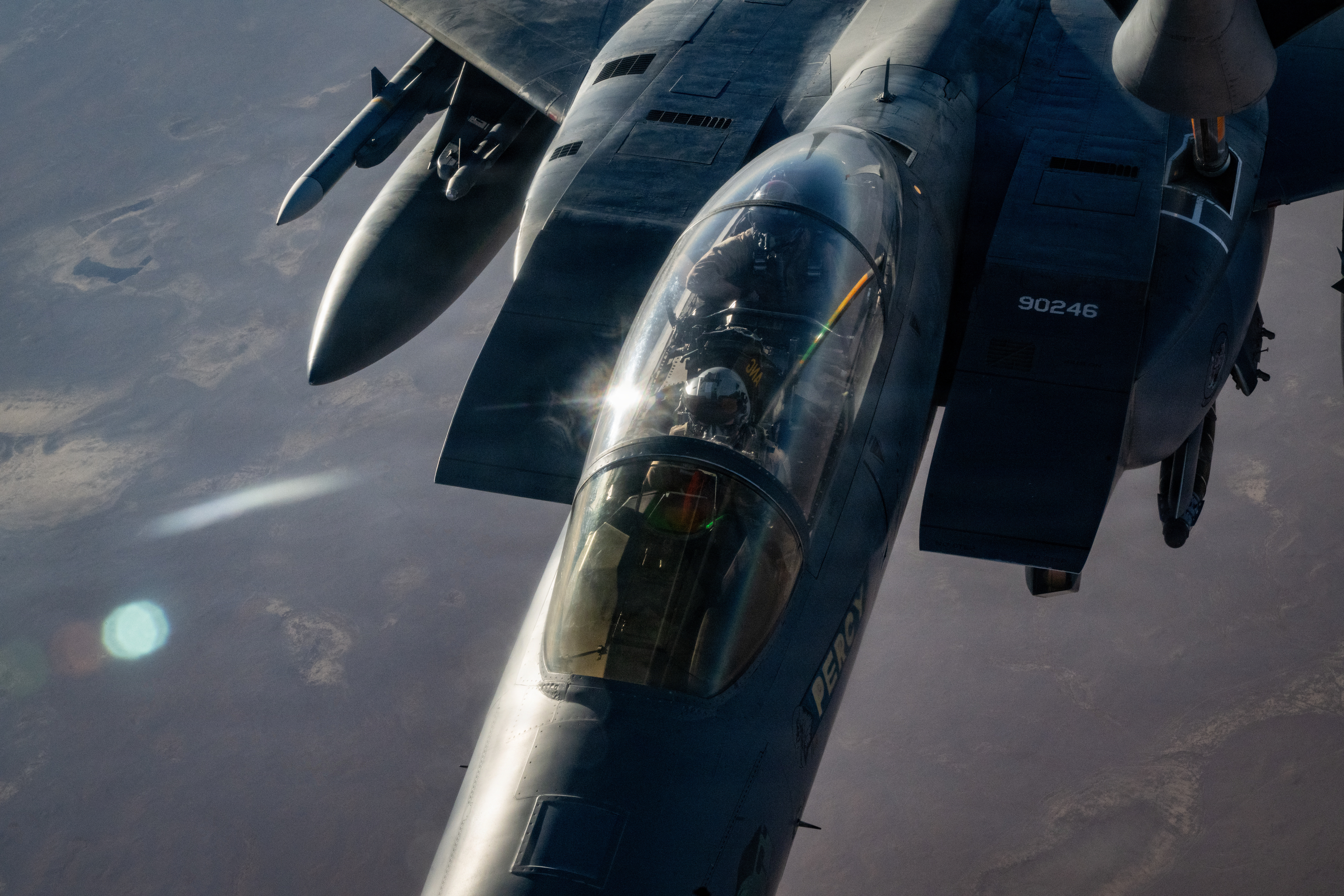 A U.S. Air Force F-15E Strike Eagle aircraft assigned to the 391st Expeditionary Fighter Squadron, receives fuel from a KC-135T Stratotanker aircraft assigned to the 32nd Expeditionary Air Refueling Squadron during a mission in the U.S. Central Command area of responsibility, Oct. 11, 2025. Aerial refueling extends the range and persistence of coalition aircraft supporting regional stability operations. (U.S. Air Force photo by Staff Sgt. Kristen Heller)