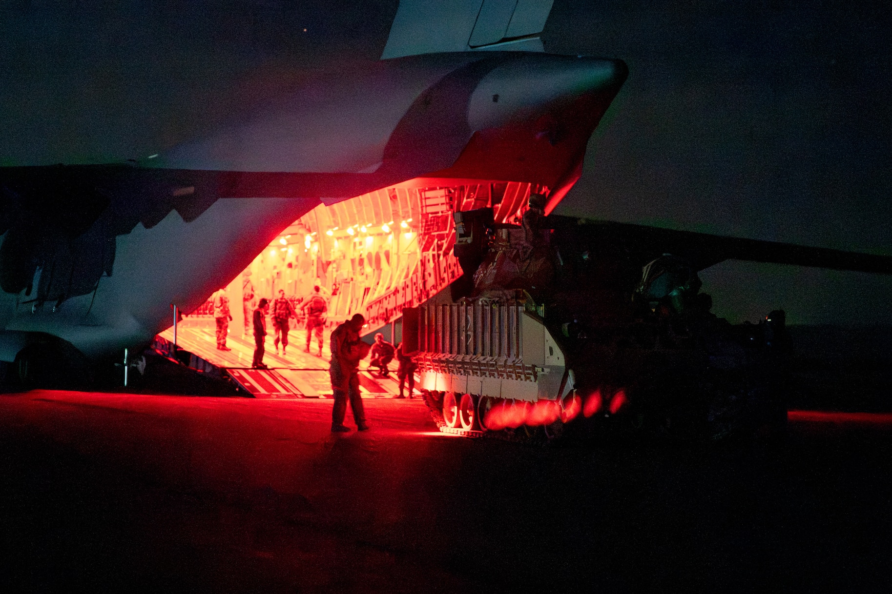 U.S. Airmen assigned to the 16th Expeditionary Airlift Squadron and U.S. Soldiers assigned to the 3rd Squadron, 278th Armored Cavalry Regiment prepare to load an M2A3 Bradley Fighting Vehicle onto a C-17 Globemaster III aircraft during a ­­­­­­­­transport mission in the U.S. Central Command area of responsibility, Nov. 24, 2025. The 16th EAS supported the U.S. Army’s 3/s278 ACR movement through an airbridge, where they provided a link between two places through aerial capabilities, to transport the Bradley and U.S. Soldiers. (U.S. Air Force photo by Airman 1st Class Travis Knauss)