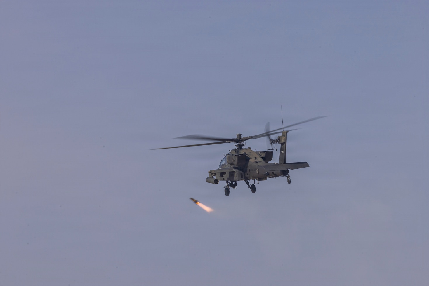 A U.S. Army AH-64D Apache assigned to Task Force Shikra (3-4 AHB), 4th Combat Aviation Brigade prepares to engage targets during Exercise Sky Shield at the Udari Range Complex, Kuwait, Dec. 5, 2025. Led by Kuwait, exercise Sky Shield included participation from the United States, Bahrain, and the United Kingdom. (U.S. Army Photo by Joe Kumzak)