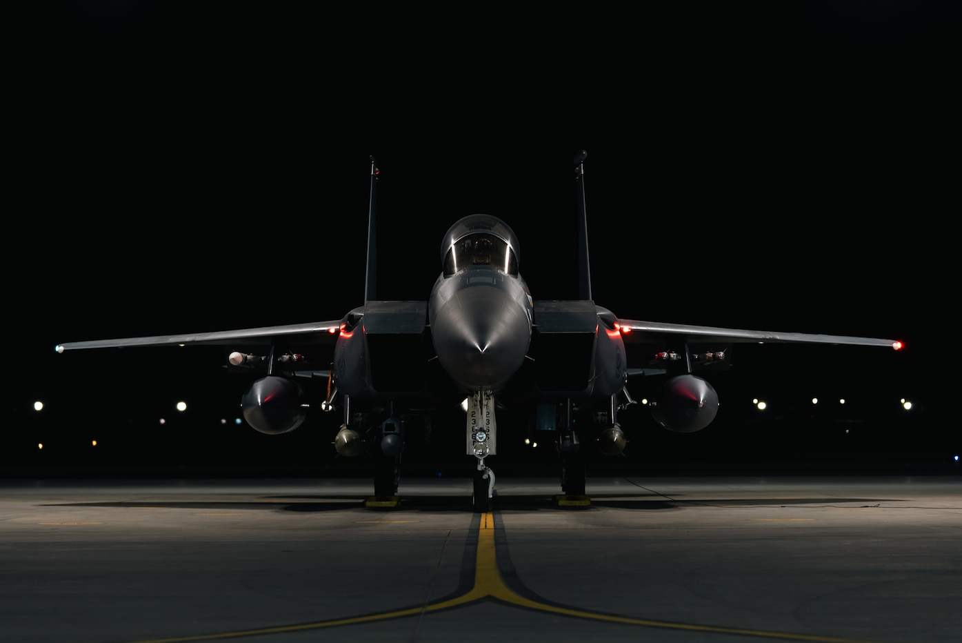 A U.S. Air Force F-15E Strike Eagle aircraft soars through the air during exercise Marauder Shield 26.1 within the U.S. Central Command area of responsibility, Nov. 11, 2025. Marauder Shield 26.1 was focused on enhancing counter-Unmanned Aircraft Systems capabilities, fighter integration, improving command and control, and fostering closer cooperation between the U.S. and Kuwait, ensuring a more secure and stable region. (U.S. Air Force photo by Staff Sgt. Tylin Rust)