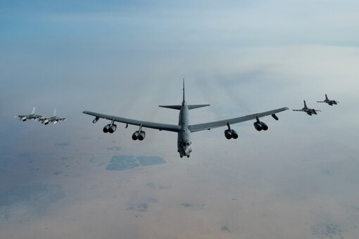 An Air Force B-52 Stratofortress aircraft, assigned to the 96th Expeditionary Bomb Squadron, flies with Qatari Rafale and U.S. F-16 Fighting Falcon fighter jets during Exercise Ferocious Falcon 6 in the U.S. Central Command area of responsibility, Nov. 17, 2025.