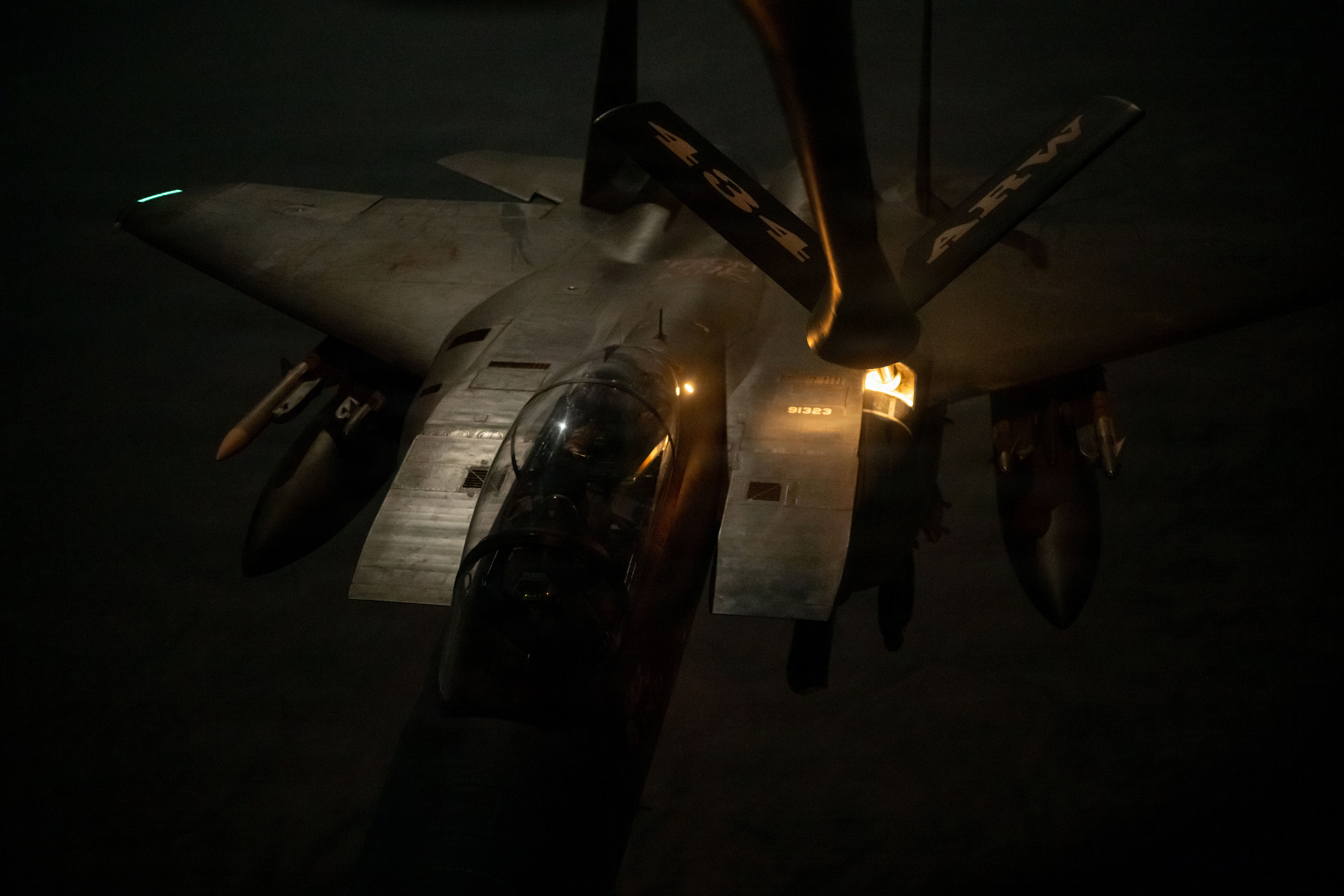 A U.S. Air Force F-15E Strike Eagle aircraft assigned to the 391st Expeditionary Fighter Squadron refuels from a KC-135 Stratotanker aircraft over the U.S. Central Command area of responsibility, Oct. 11, 2025. The KC-135 Stratotanker aircraft played a key role in integrating Air Mobility Command and Air Combat Command capabilities, ensuring U.S. aircraft can execute airpower missions across the CENTCOM AOR. (U.S. Air Force photo by Tech. Sgt. Nicholas Monteleone)