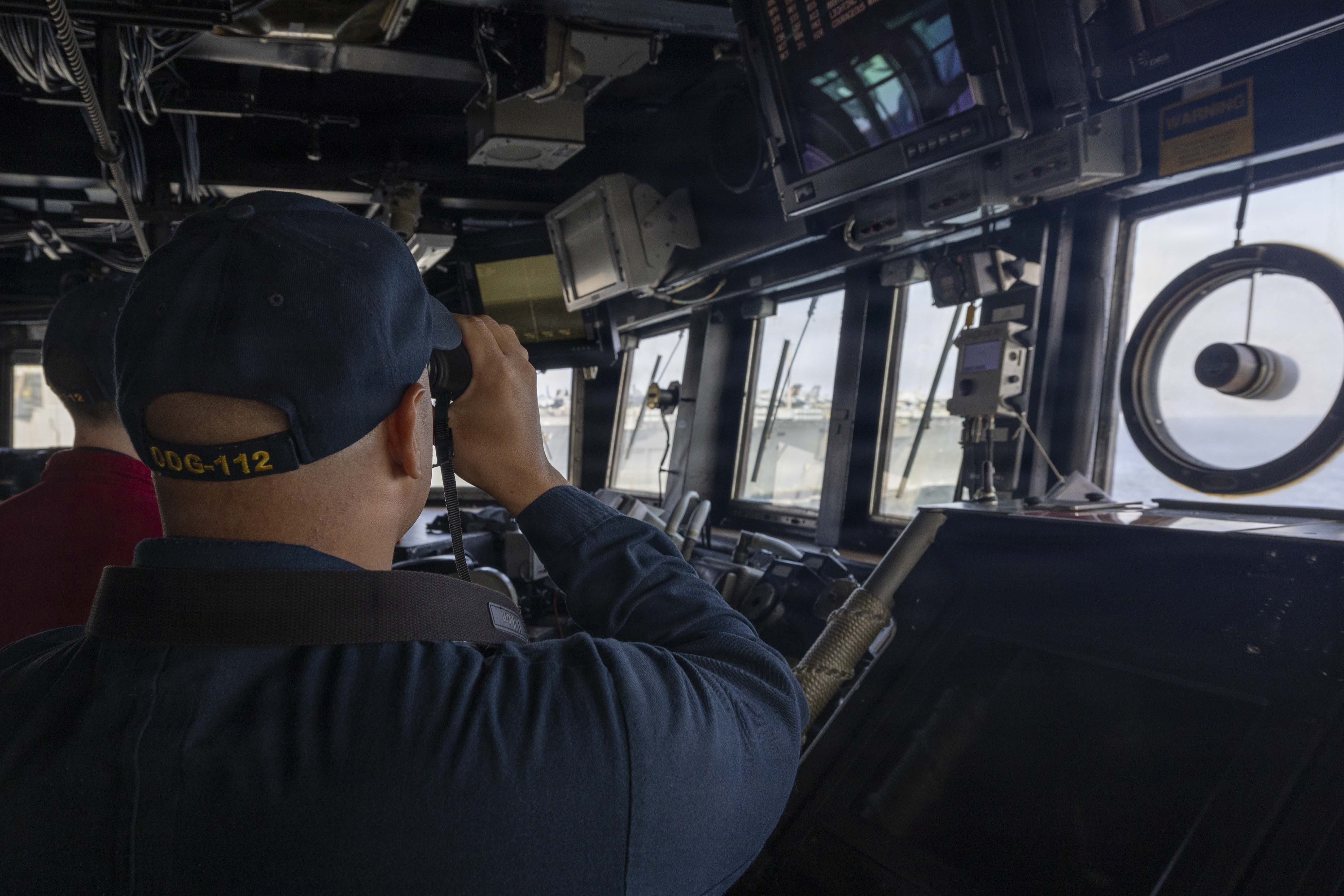 U.S. CENTRAL COMMAND AREA OF RESPONSIBILITY (Jan. 27, 2026) U.S. Navy Ensign Norberto Betancourt, assigned to Arleigh Burke-class guided-missile destroyer USS Michael Murphy (DDG 112), observes operations from the pilot house during a replenishment-at-sea with Lewis and Clarke-class dry cargo ship USNS Carl Brashear (T-AKE-7) in the U.S. Central Command (CENTCOM) area of responsibility. Michael Murphy is deployed to the U.S. 5th Fleet area of operations to support maritime security and stability in the CENTCOM area of responsibility. (U.S. Navy photo by Mass Communication Specialist 1st Class Jonteil Johnson)