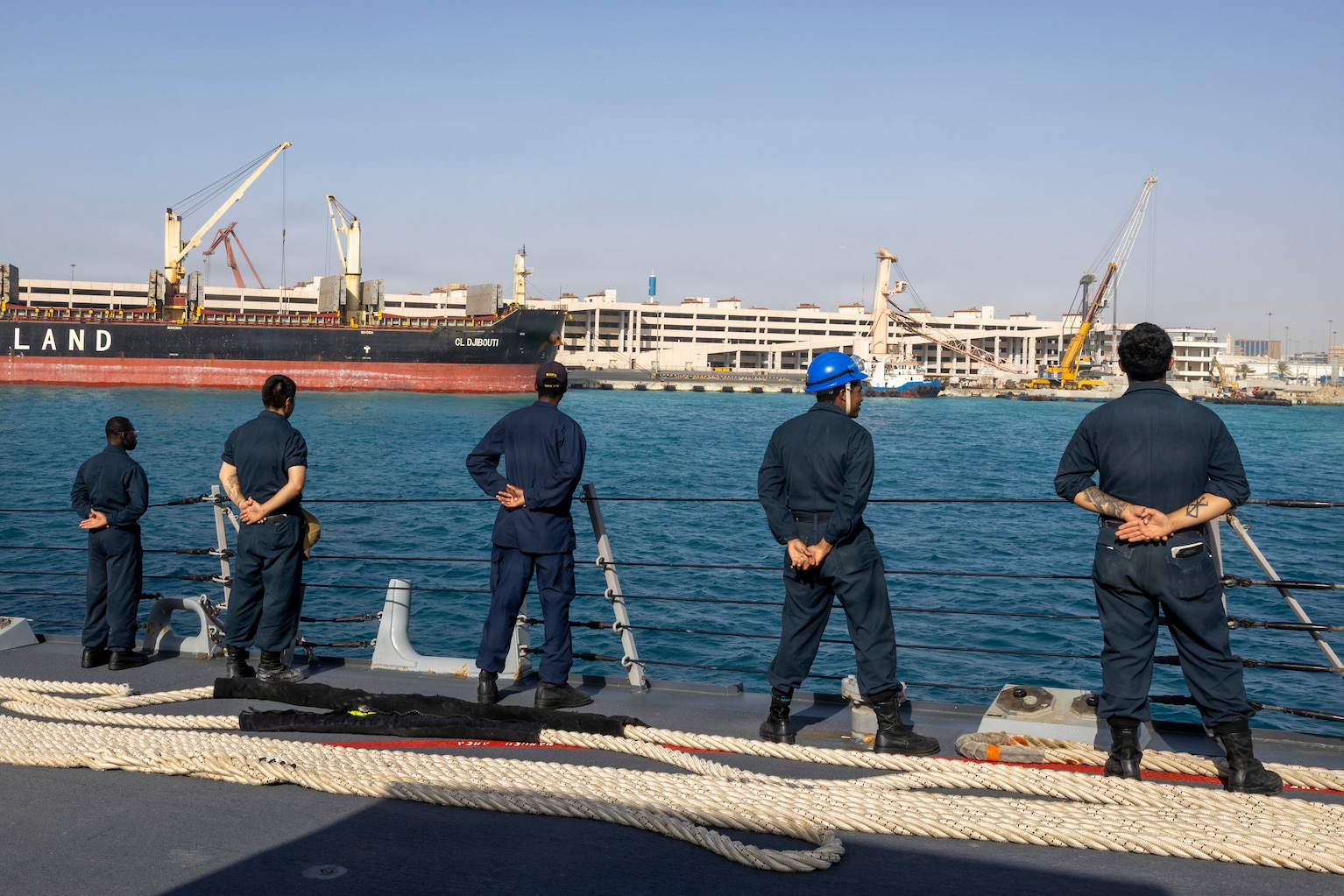 U.S. Sailors, assigned to Arleigh Burke-class guided-missile destroyer USS Delbert D. Black (DDG 119), man the rails during a scheduled routine port visit to Jeddah, Saudi Arabia, Feb. 4, 2026. Delbert D. Black is deployed to the U.S. 5th Fleet area of operations to support maritime security and stability in the U.S. Central Command area of responsibility. (U.S. Navy photo by Mass Communication Specialist 1st Class Wendy Arauz)