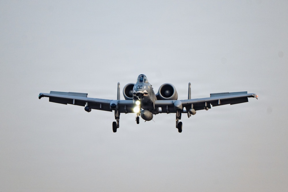 A U.S. Air Force A-10C Thunderbolt II aircraft assigned to the 75th Expeditionary Fighter Squadron prepares to land at a base in the U.S. Central Command area of responsibility, Jan. 29, 2026. (U.S. Air Force photo by Staff Sgt. Tylin Rust)