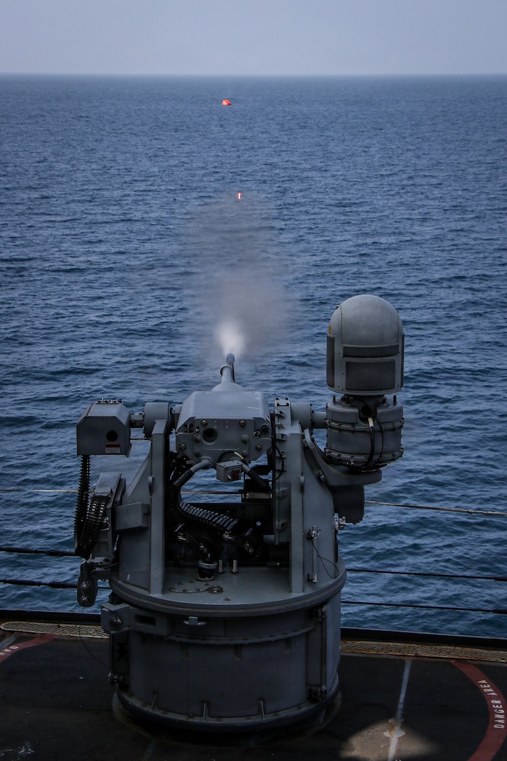 A Mark 38 25mm machine gun fires at a training target during a live-fire exercise aboard Arleigh Burke-class guided-missile destroyer USS Frank E. Petersen Jr. (DDG 121), Feb. 10, 2026. Frank E. Peterson Jr. is deployed to the U.S. 5th Fleet area of operations to support maritime security and stability throughout the Middle East. (U.S. Navy photo by Mass Communication Specialist 2nd Class Christian Kibler)