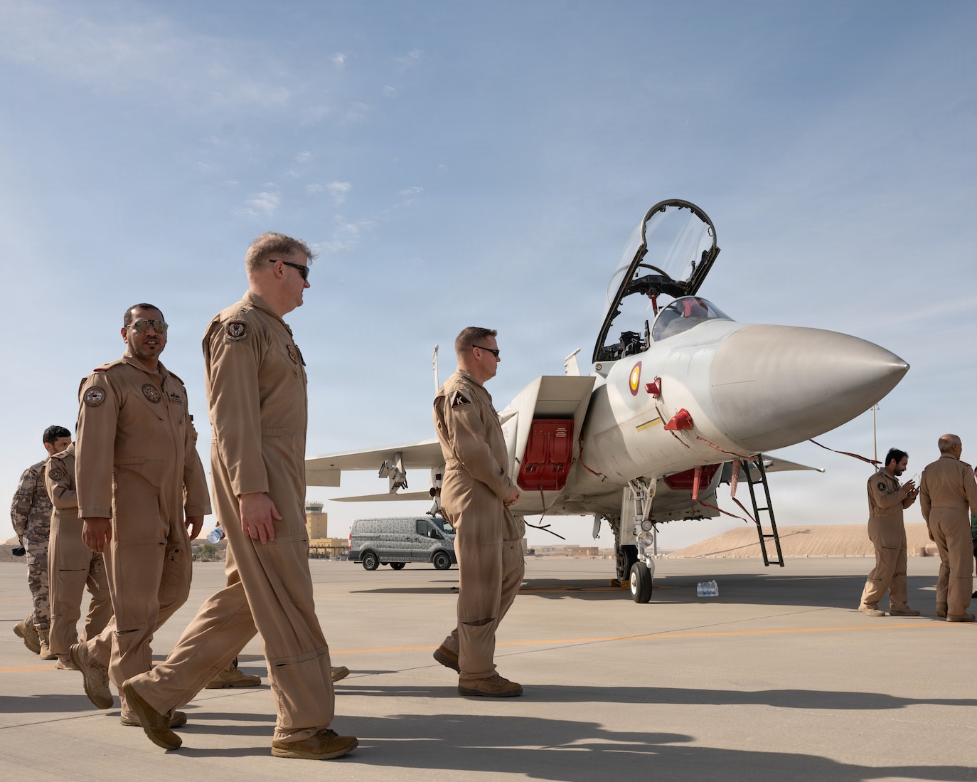 Qatar Emiri Air Force and U.S. Air Force leaders walk and chat while visiting aircraft static displays during Partnership Day at Al Udeid Air Base, Qatar, Feb. 11, 2026. The event showcased interoperability and appreciation for host nation partners, bringing together Qatari military members, families, U.S. Embassy Doha representatives, joint U.S. service members and coalition forces. (U.S. Air Force photo by Tech. Sgt. Chris Thornbury)