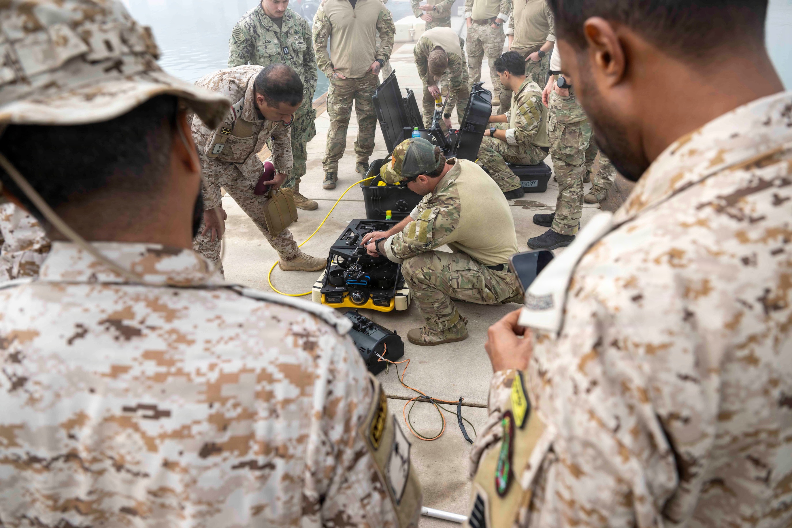 U.S. service members, assigned to Task Force 56, demonstrate remotely operated vehicles during an explosive ordnance disposal subject matter expert exchange with Royal Saudi Naval Forces onboard Naval Support Activity Bahrain, Feb. 9, 2026. The joint training provided an invaluable opportunity to strengthen interoperability and advance military-to-military cooperation for an array of capabilities. (U.S. Army photo by Private First Class Nicolas Uker)