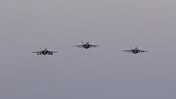 Three F/A-18E Super Hornets, attached to Strike Fighter Squadron (VFA) 14, fly over Nimitz-class aircraft carrier USS Abraham Lincoln (CVN 72) during Operation Epic Fury, April 2, 2026. (U.S. Navy photo)